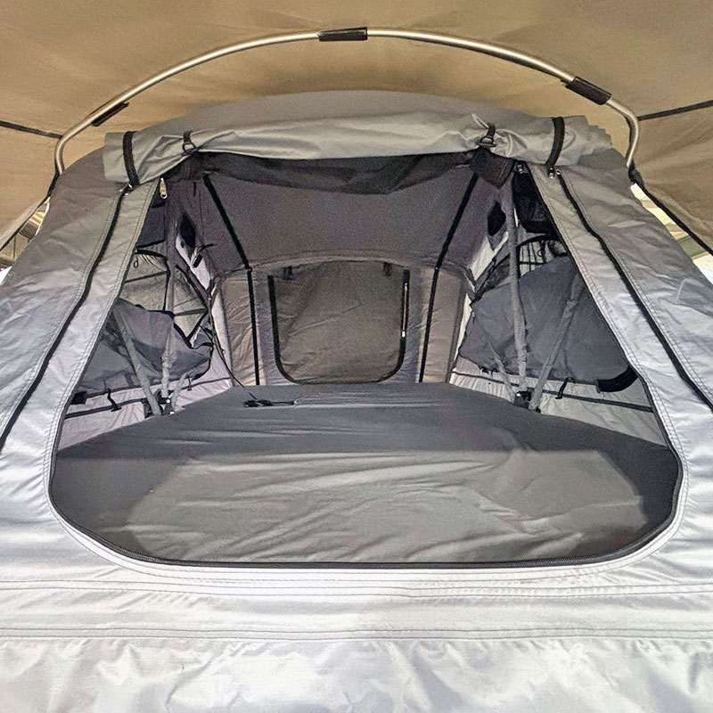 Da das Zelt nicht auf dem Boden steht, ergibt sich ein viel wärmerer Schlafplatz als in einem klassischen Zelt.